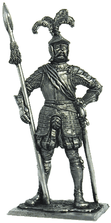 Английская армия Генриха VIII пополнялась наёмниками не для численности, а ради их владения определённым типом оружия. В Англии не было достаточного количества пикинёров и аркебузиров. Отряды немецких ландскнехтов, профессионально владевших этим оружием, участвовали во всех континентальных кампаниях Генриха. Капитан облачён в дорогой, воронёный с полосами полированной белой стали пехотный полудоспех, надетый на кольчугу. На голове шлем бургиньот с подвижными нащёчниками и козырьком, украшенный страусовыми перьями. К коротким малиново-зелёным штанам пришиты зелёные чулки. Через правое плечо повязан красный тканевый шарф, символизирующий офицерское достоинство. Кроме меча капитан вооружён копьём с красной кистью и листовидным стальным наконечником.