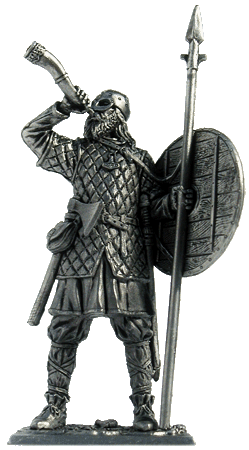 Качество защитного снаряжения воина зависело от его богатства и общественного положения. Многие довольствовались стёгаными кожаными куртками. Стальной полусферический шлем делался из четырёх частей и обычно снабжался лицевой полумаской. Круглый деревянный щит, диаметром около 1 м, мог обтягиваться кожей и укреплялся металлическим ободом и умбоном. Викинги имели на вооружении короткие копья для рукопашного боя, топоры и мечи. Многие носили на груди амулеты в форме молота Тора, изготовленные из драгоценного металла. Сигнальный рог украшался резьбой по кости или имел замысловатую оправу из серебра или золота.